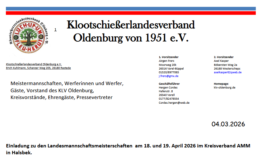 Neues Wurfgerät ab dem 01. Juli 2025 für den Spielbetrieb zugelassen – Rückkehr eines bekannten Herstellers. Wiesmoor, 20. Juni 2025 – Der Friesische Klootschießer Verband (FKV) gibt bekannt, dass ab dem 01. Juli 2025 ein neues Wurfgerät für den offiziellen Spielbetrieb zugelassen ist.